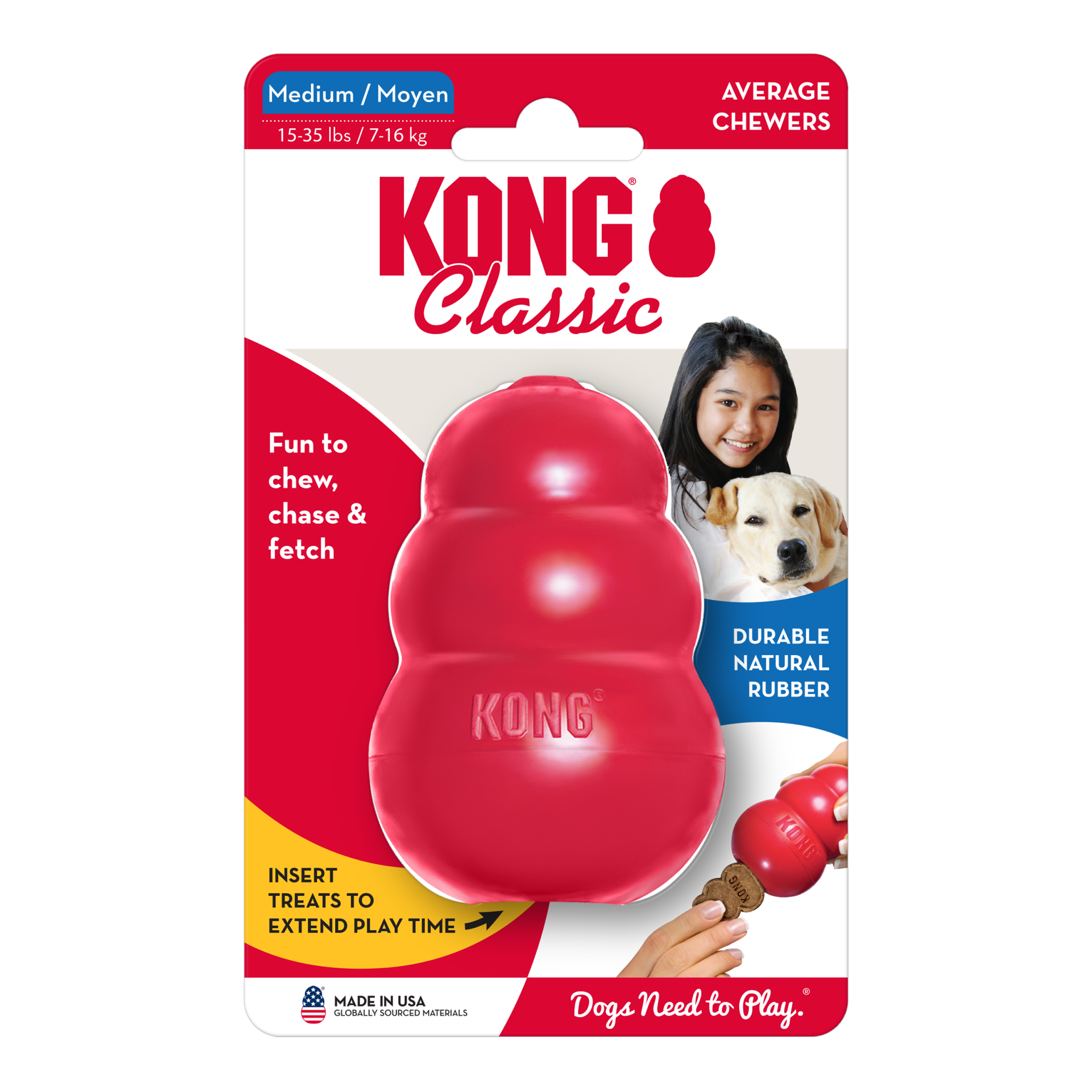 The KONG Classic is the gold standard of dog toys and has become the staple for dogs around the world for over forty years. Offering enrichment by helping satisfy dogs’ instinctual needs, the KONG Classic’s unique natural red rubber formula is ultra-durable with an erratic bounce that is ideal for dogs that like to chew while also fulfilling a dog’s need to play. Want to extend play time? Be sure to stuff with tempting bits of kibble and entice with a dash of peanut butter. Add to the fun by adding KONG Snacks and topping with KONG Easy Treat.