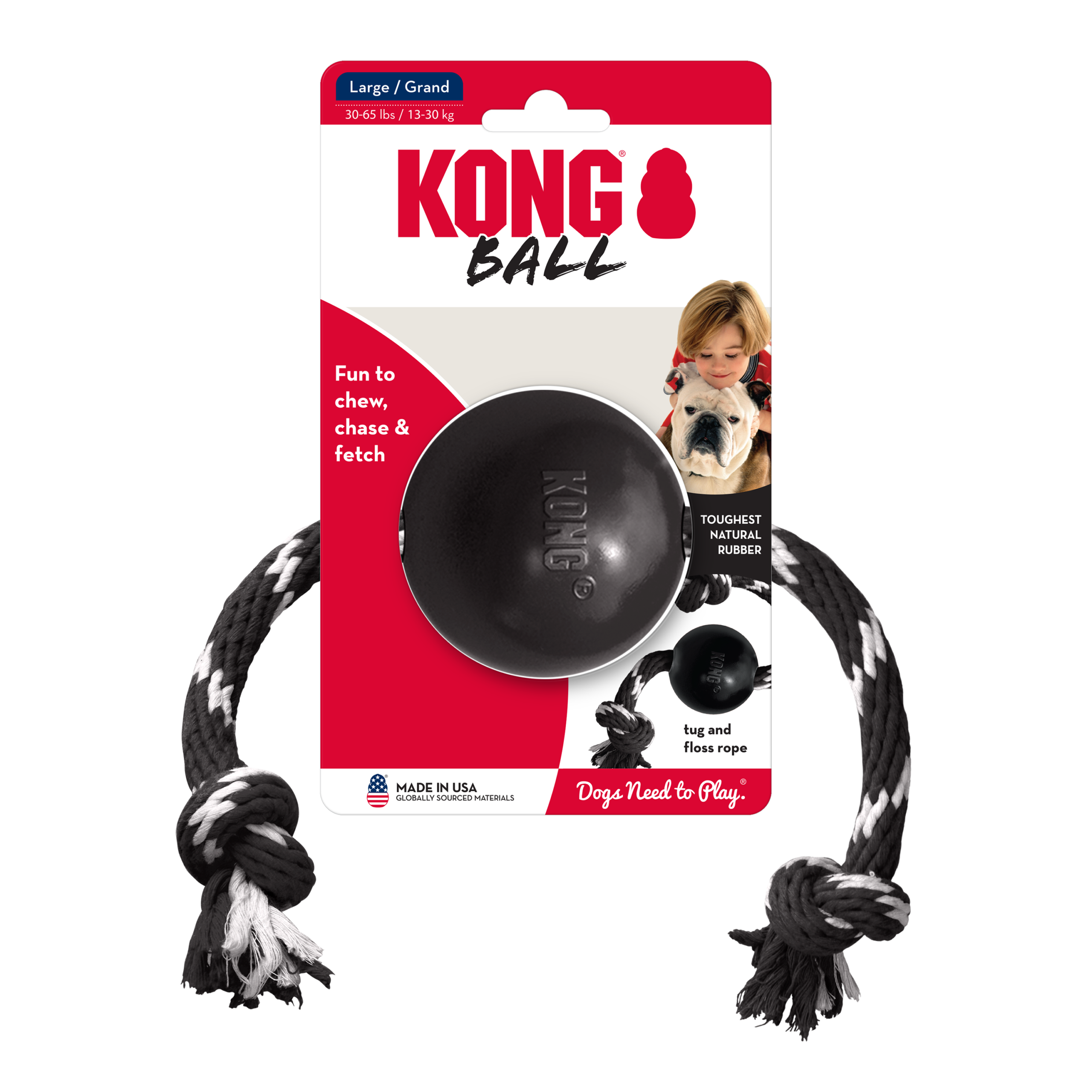 Interactive play gets energized with a durable rubber ball and cotton rope made from KONG Extreme –the most durable rubber formula is sure to make play time last.