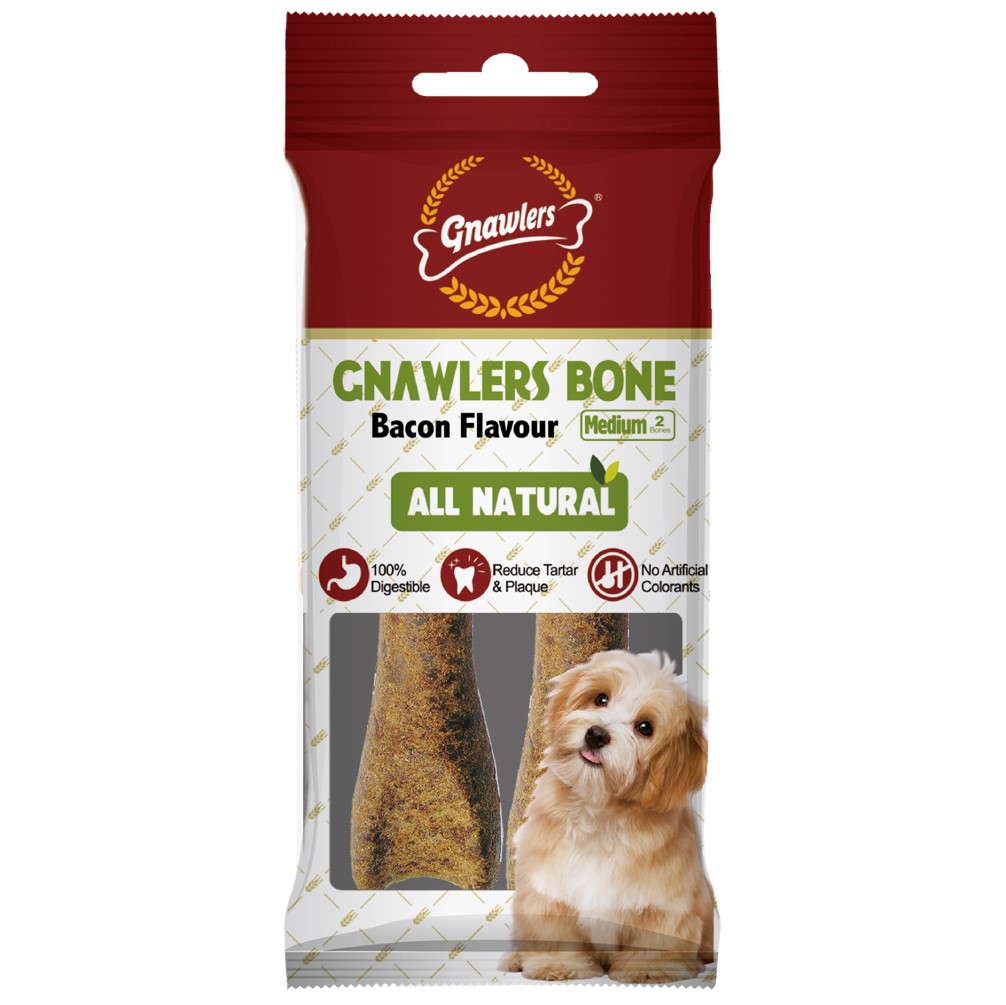 Reward your dog with the delicious and nutritious 2pc Gnawlers Bone Bacon 11cm (90g). These savory bacon chews are perfect for dogs who love a good snack. Made with natural ingredients, these treats are rawhide-free, 100% digestible, and free from artificial flavours and colourants. Your dog will go head over paws for the natural bacon flavour!