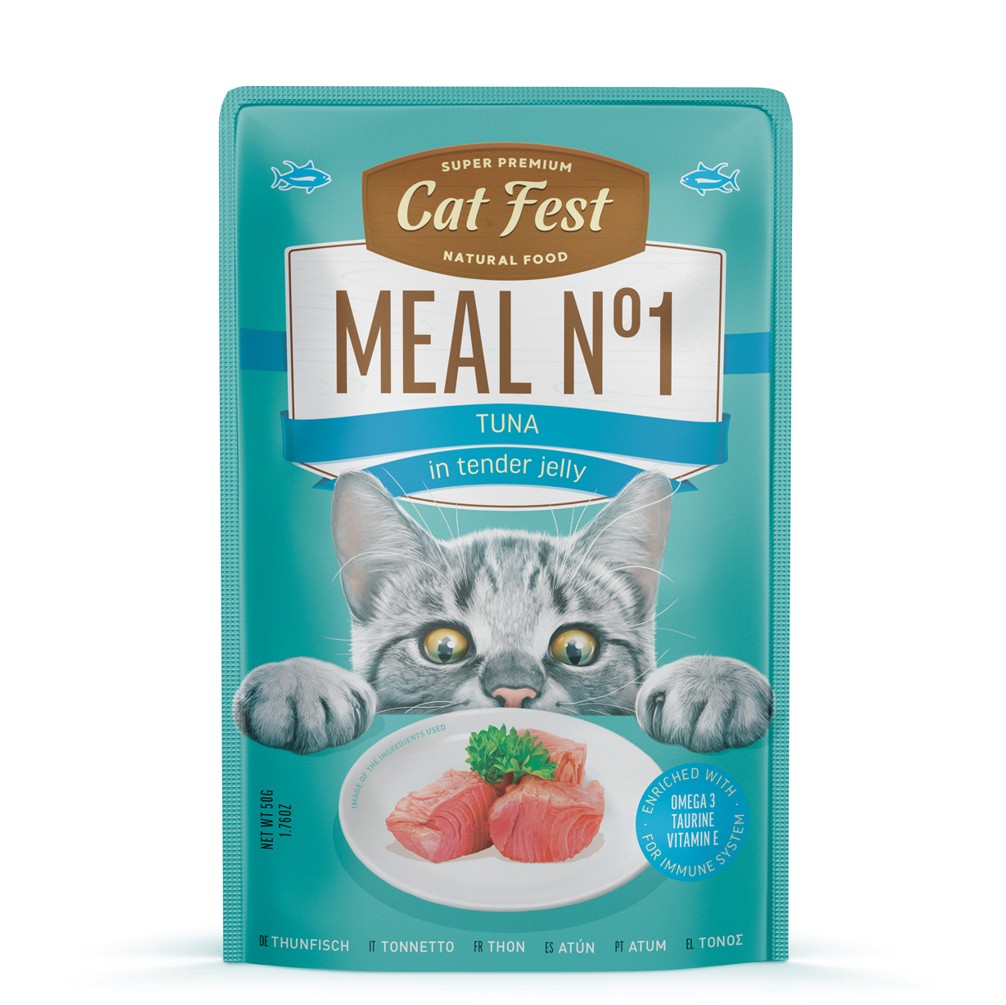 Our MEAL № 1 is crafted from red (belly) tuna meat which cats adore for its strong aroma and delicious taste. Serve it as a complete meal or a tasty topper — either way, your cat will come running.