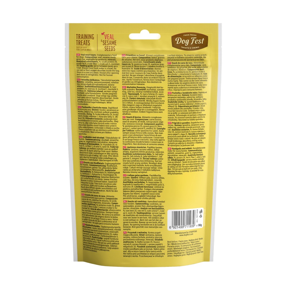 Pieces of veal are enriched with sesame seeds and green tea. This treat is rich in vitamins, minerals and amino acids essential for good dog health.