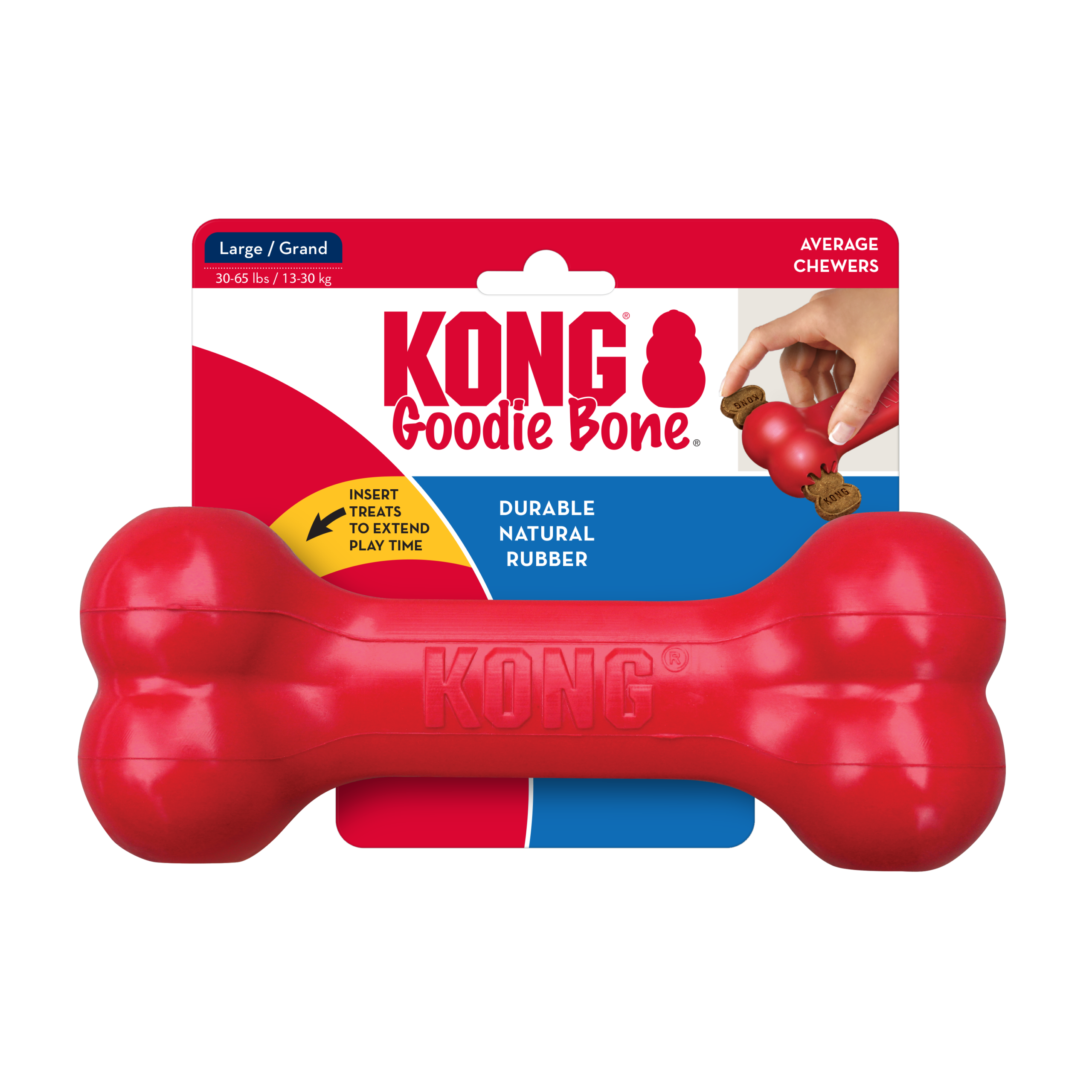 The KONG Goodie Bone™ toy engages dogs that delight in chew sessions. Made from the KONG Classic unique natural red rubber formula, this bone features the patented Goodie Grippers ™ that turn this entertaining toy into a fun treat dispensing challenge that can be stuffed with your dog’s favorite kibble. Want to extend the chew session? Stuff with KONG Snacks™ and entice with a bit of KONG Easy Treat™.