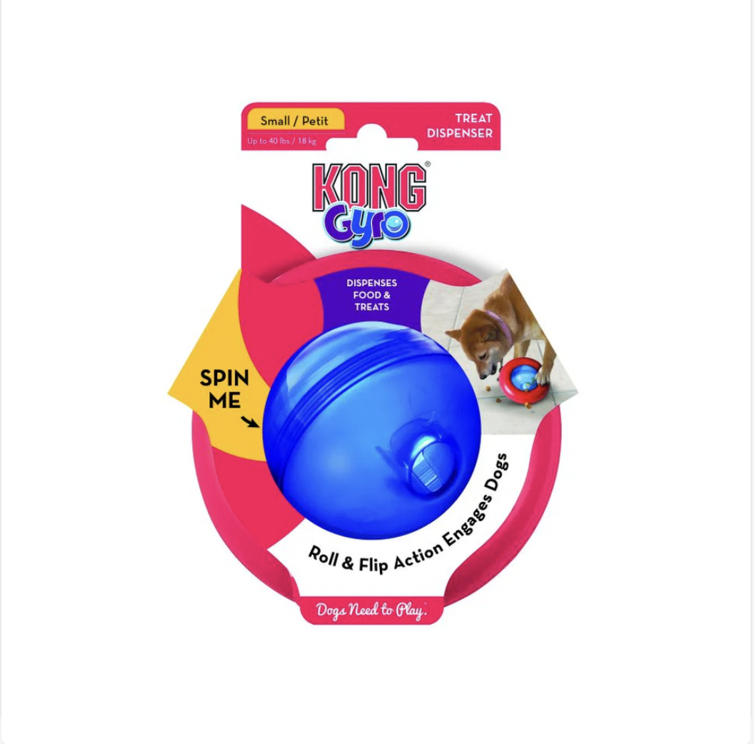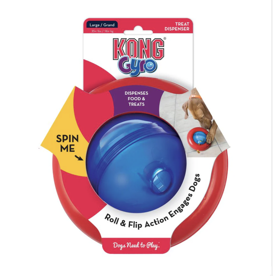 The KONG Gyro is sure to entertain with irresistible roll and flip action keeping dogs enticed and intrigued. With the center spinning orb and static outer ring, this dynamic toy encourages dogs to push, paw and roll the GYRO, delightfully dispensing tasty treat rewards along the way. Ideal for independent play, stuff with snacks or kibble for added fun and extended playtime. Available in large and small sizes.