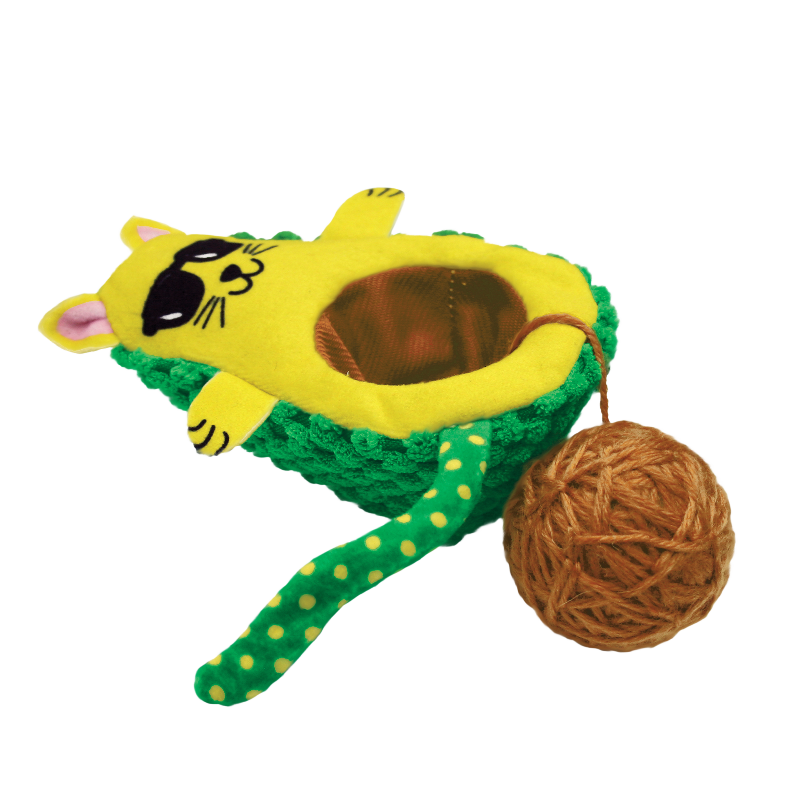 Kitties love to guac and roll—and wrestle—with the cat’s soft crinkly body while the bouncy, rattling tethered yarn ball creates irresistible action that sparks batting and pouncing fun. This multi-sensory feast is seasoned with KONG North American Premium Catnip.