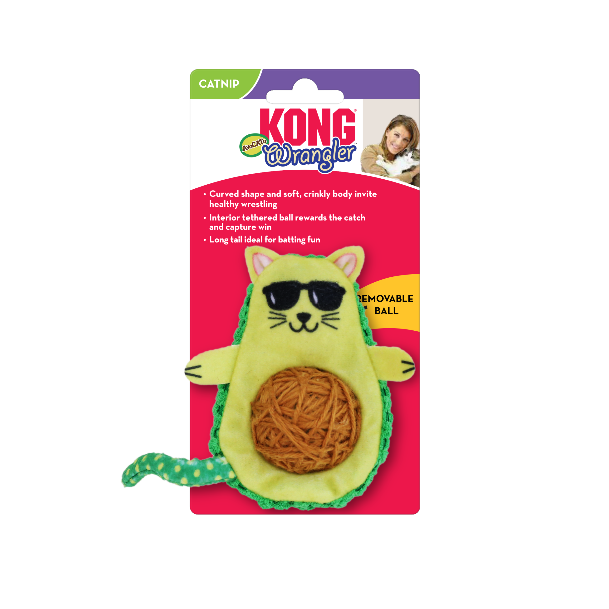 KONG Wrangler AvoCATo satisfies cats’ hunger for wrestling with a curved shaped and a crinkly soft body that invites healthy wrestling. The lightweight, tethered yarn ball sparks batting fun with an erratic bounce and rattle sounds that reward natural instincts. A long tail invites catch and capture play while KONG Premium North American Catnip ensures a long, stimulating fiesta of fun.