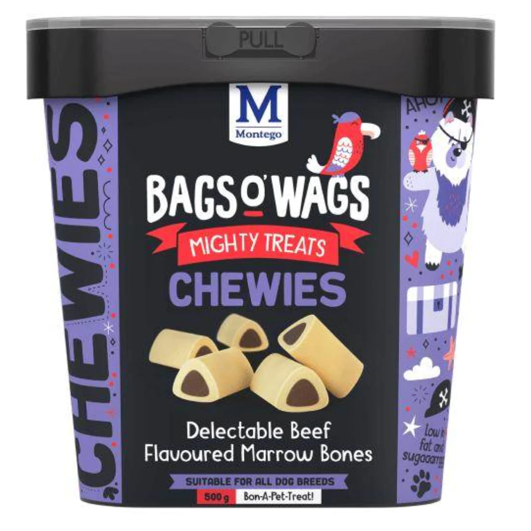 Montego Bags O’ Wags Marrow Bones are highly nutritious, beef-flavoured chew treats designed for training, rewarding good behaviour, or as a tasty between-meal snack for dogs of all breeds and sizes.