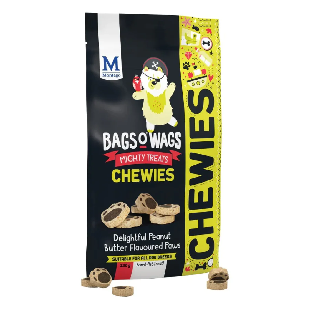 Montego Bags O’ Wags Peanut Butter Paws are chewable, bite-sized treats designed for daily use. They’re ideal as a reward for good behaviour, an incentive during training, or a tasty snack between meals.