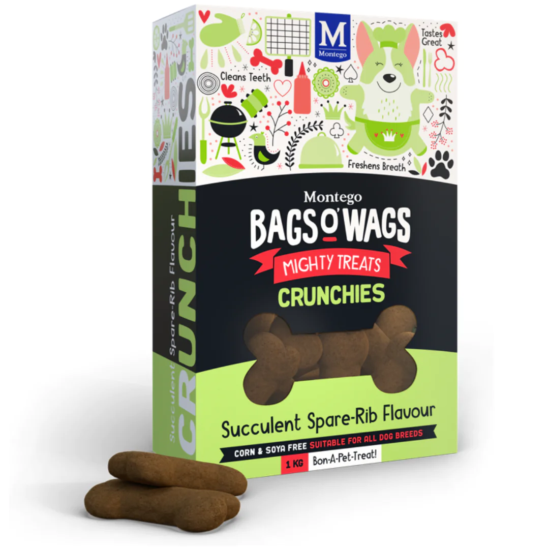 Montego Bags O’ Wags Succulent Spare-Rib Flavour are crunchy, bone-shaped dog treats topped with pet-friendly icing handcrafted in small batches to deliver maximum taste, nutrition, and joy in every bite! 1kg of pure awesomeness for your good boys and girls!